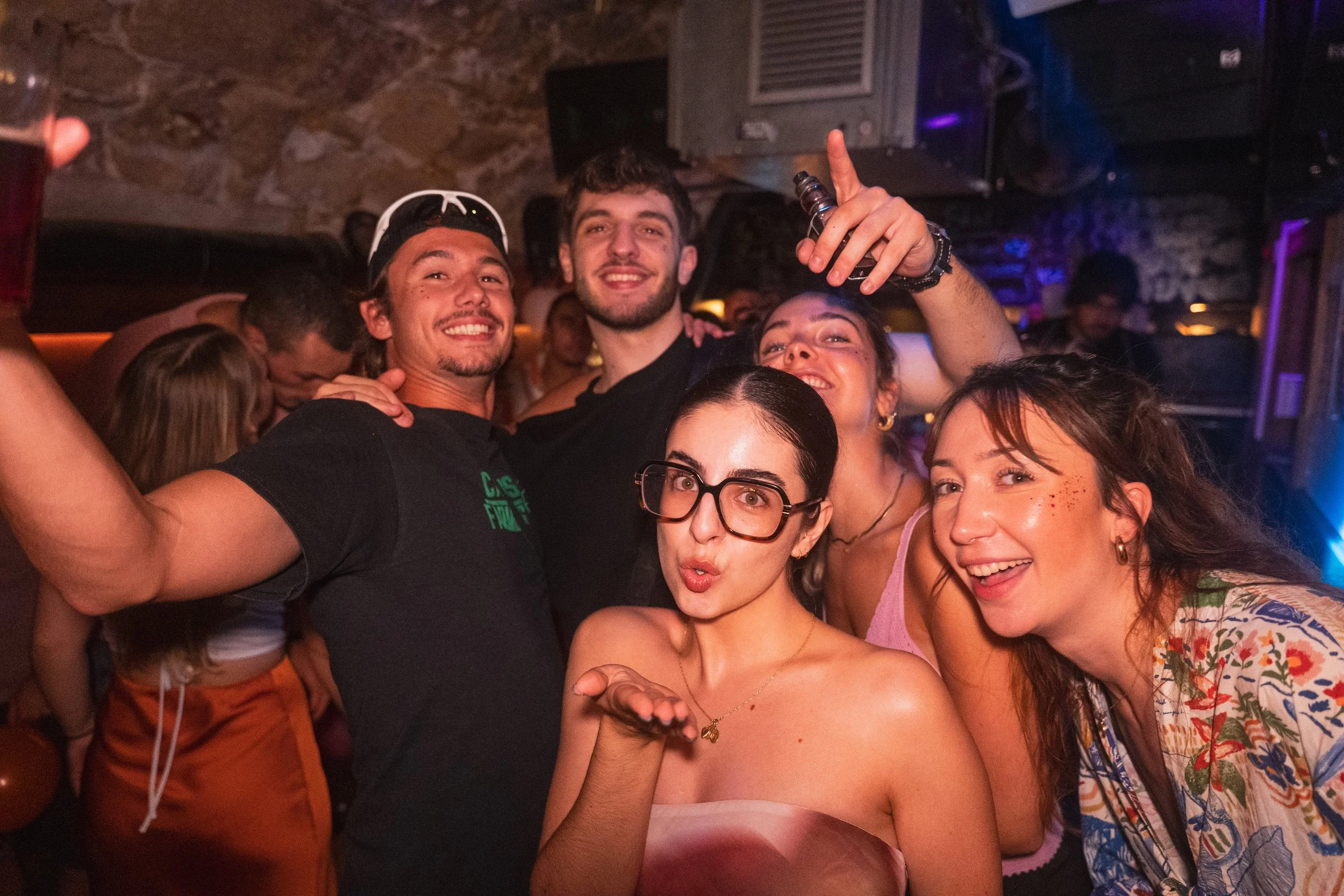 Un groupe de cinq amis souriants et posant pour une photo lors d'une fête ou d'un rassemblement dans un endroit avec une ambiance chaleureuse et festive.