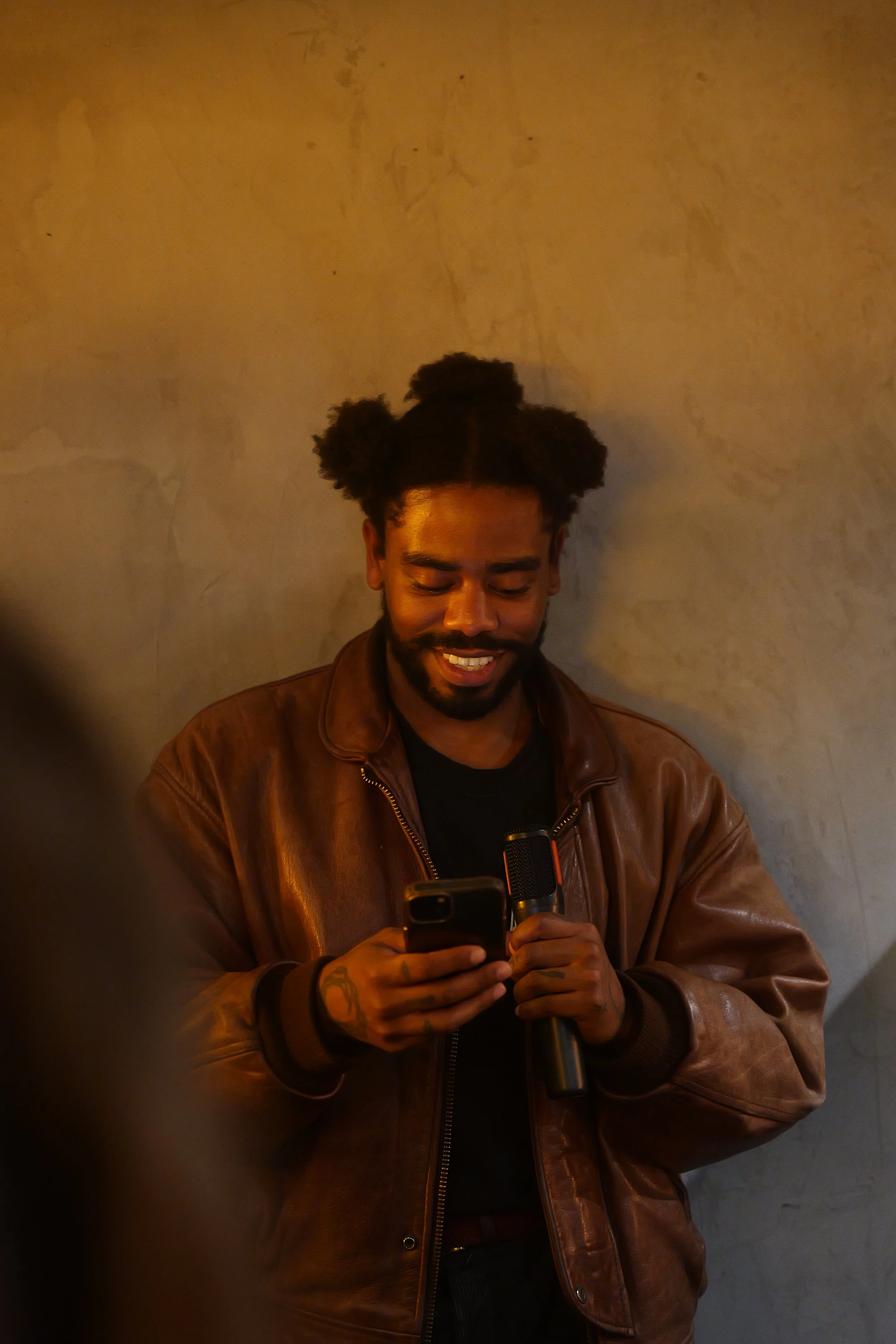 Un homme souriant portant une veste en cuir marron, tenant un téléphone portable et un micro, se tenant contre un mur beige